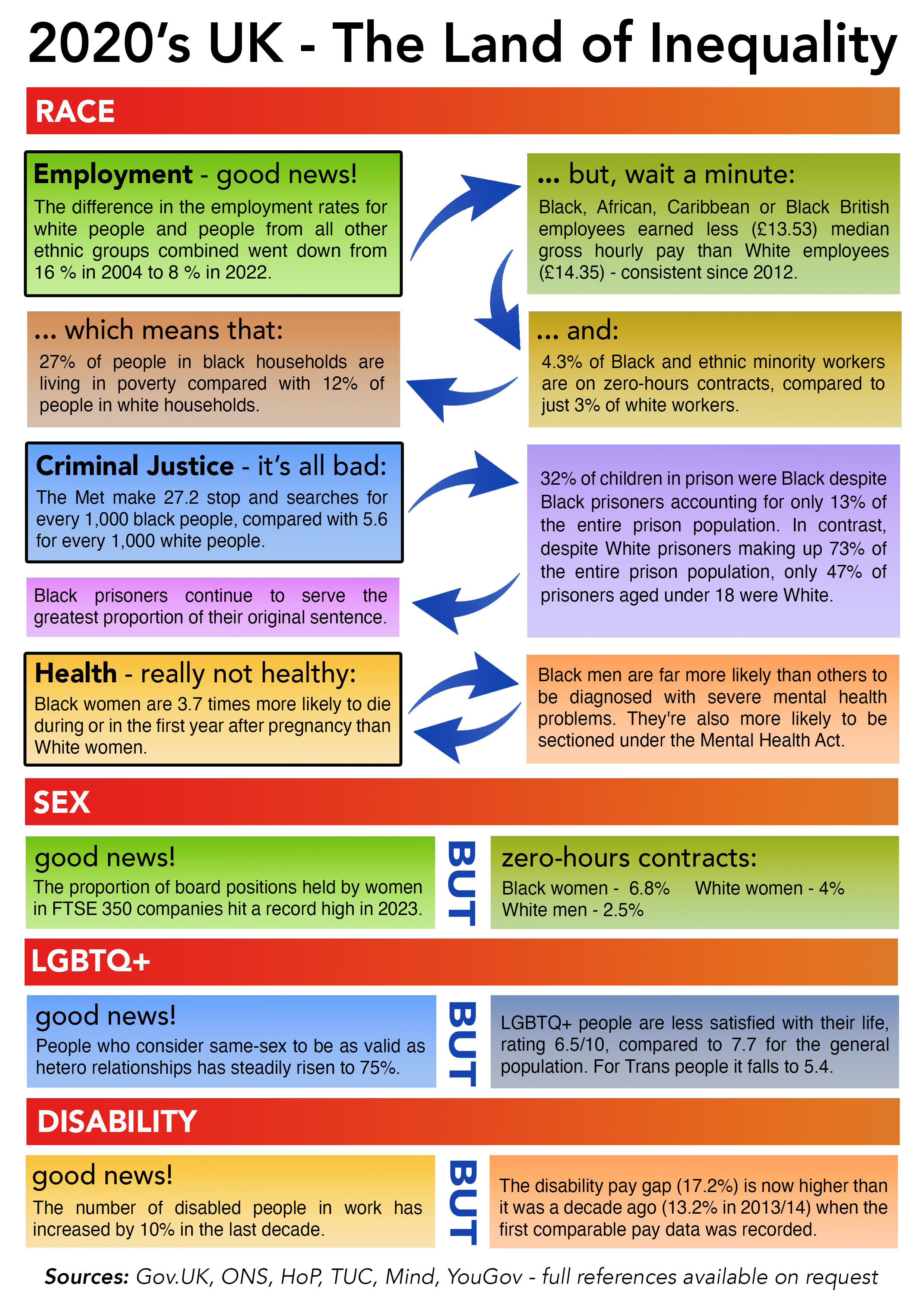 I’ve put together this graphic of the experiences of some ‘marginalised’ people in the UK in the 2020’s, focusing on key issues that determine quality of life. Of course, statistics can be used to ‘prove’ all sorts of conclusions, I could have chosen other characteristics and figures, but I hope that the range of issues here and the reliability of sources will help paint a realistic picture of our social progress towards equity. There have been some positive changes, but I think we must conclude that over the last 61 years (since the 1965 Race Relations Act, the first piece of Equalities legislation), progress has been painfully slow and has even begun to reverse in some respects.